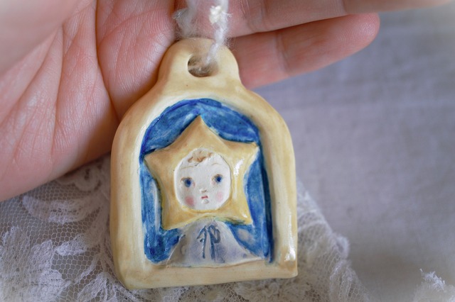 size 約6㎝×4.5㎝ 星の子ちゃんの陶レリーフ。 吊り下げて飾ることができます。 つやつやの瞳はブルー。 まっすぐなまなざしです。