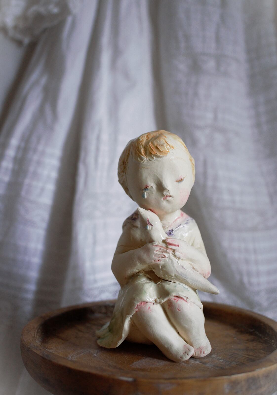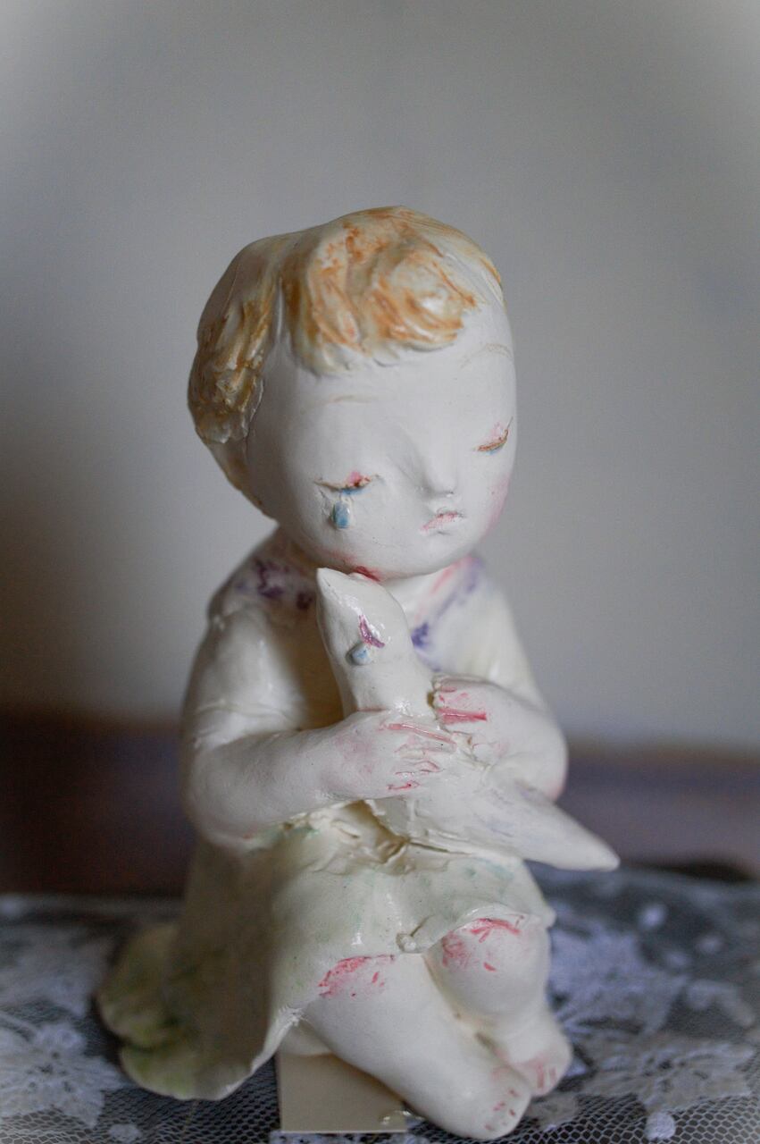 白い鳩を抱いて、ひとつぶ 涙を流す女の子。