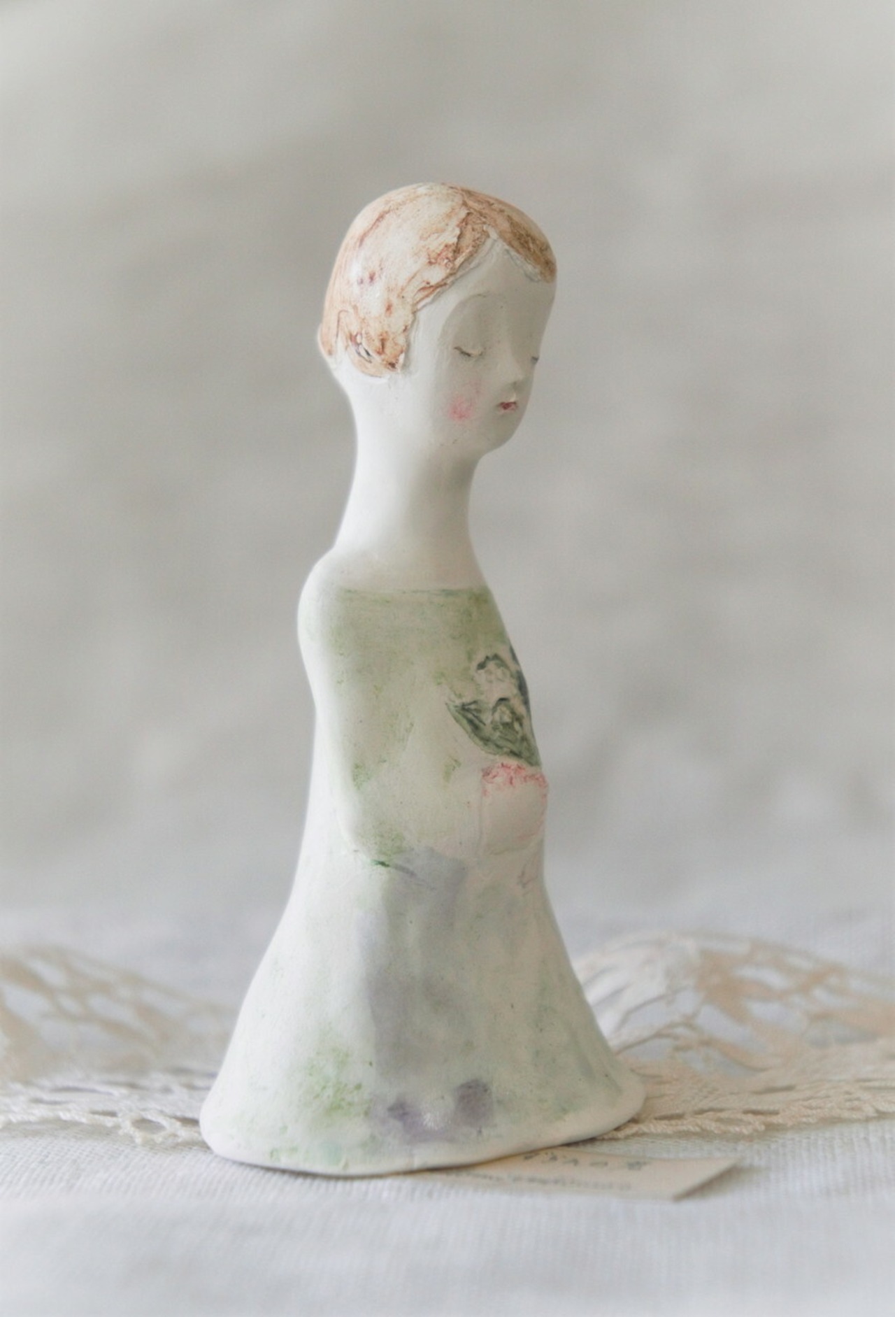 すずらんのブーケを持つ女性。誰かから受け取ったのでしょうか。