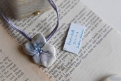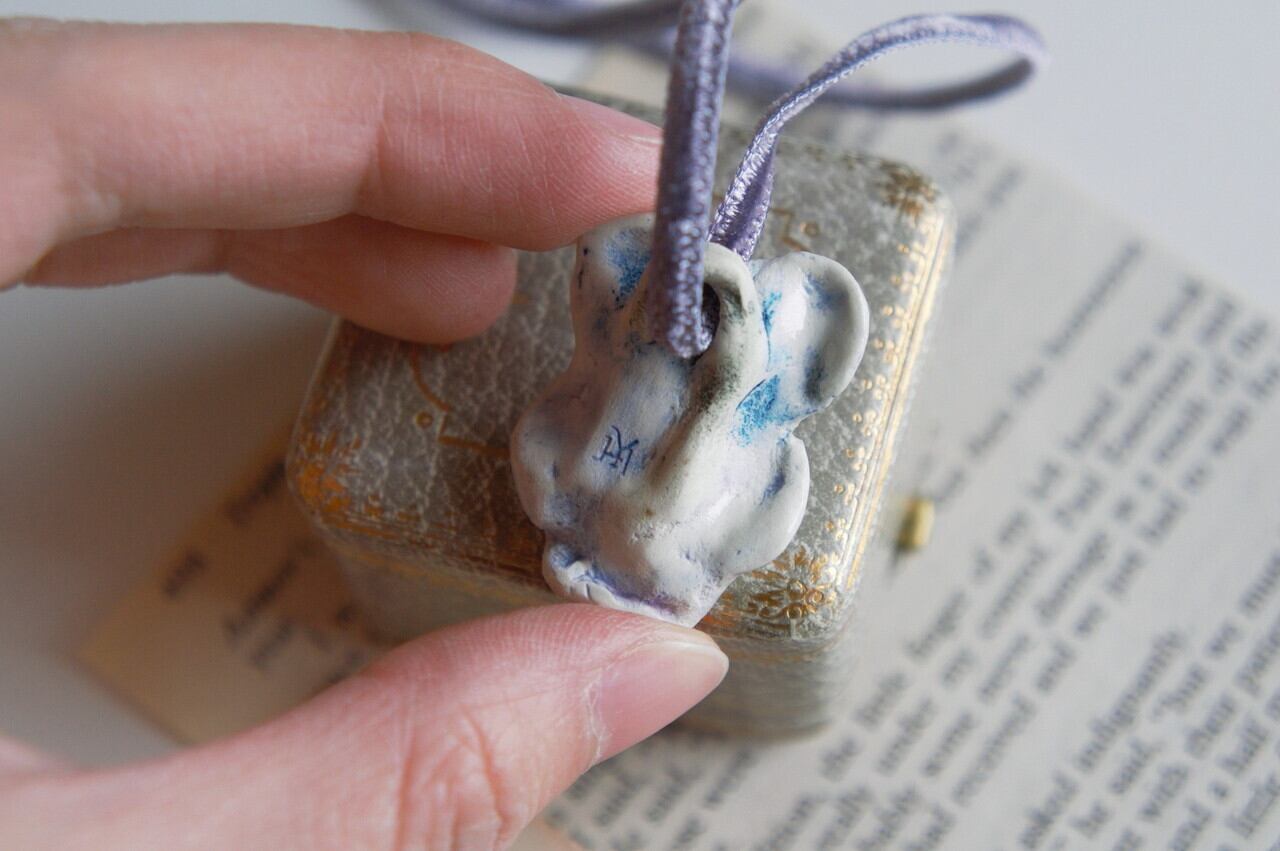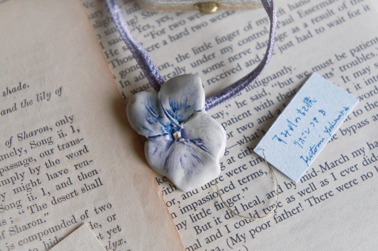すみれ色の極細ベルベットリボンを通した、すみれの陶飾りです。