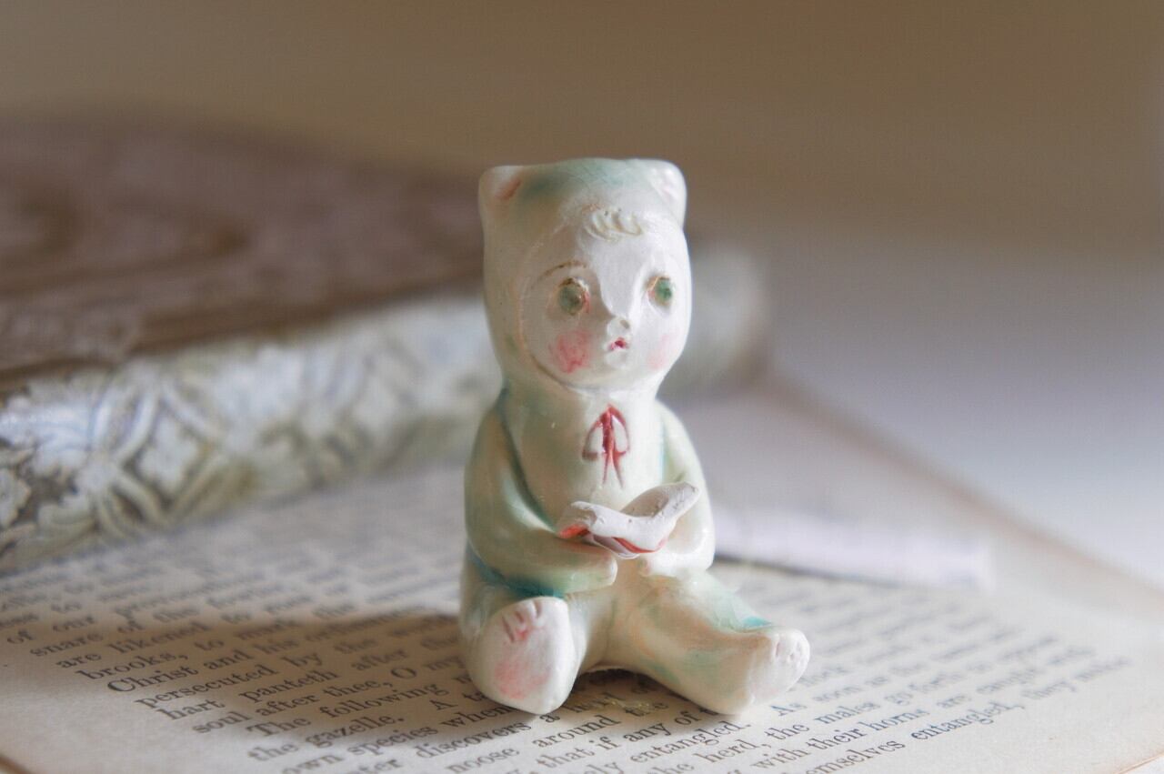 薄いグリーンのくまぼうやが赤い本を読んでいます。