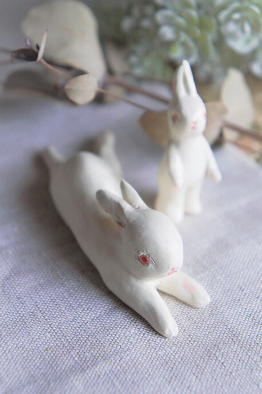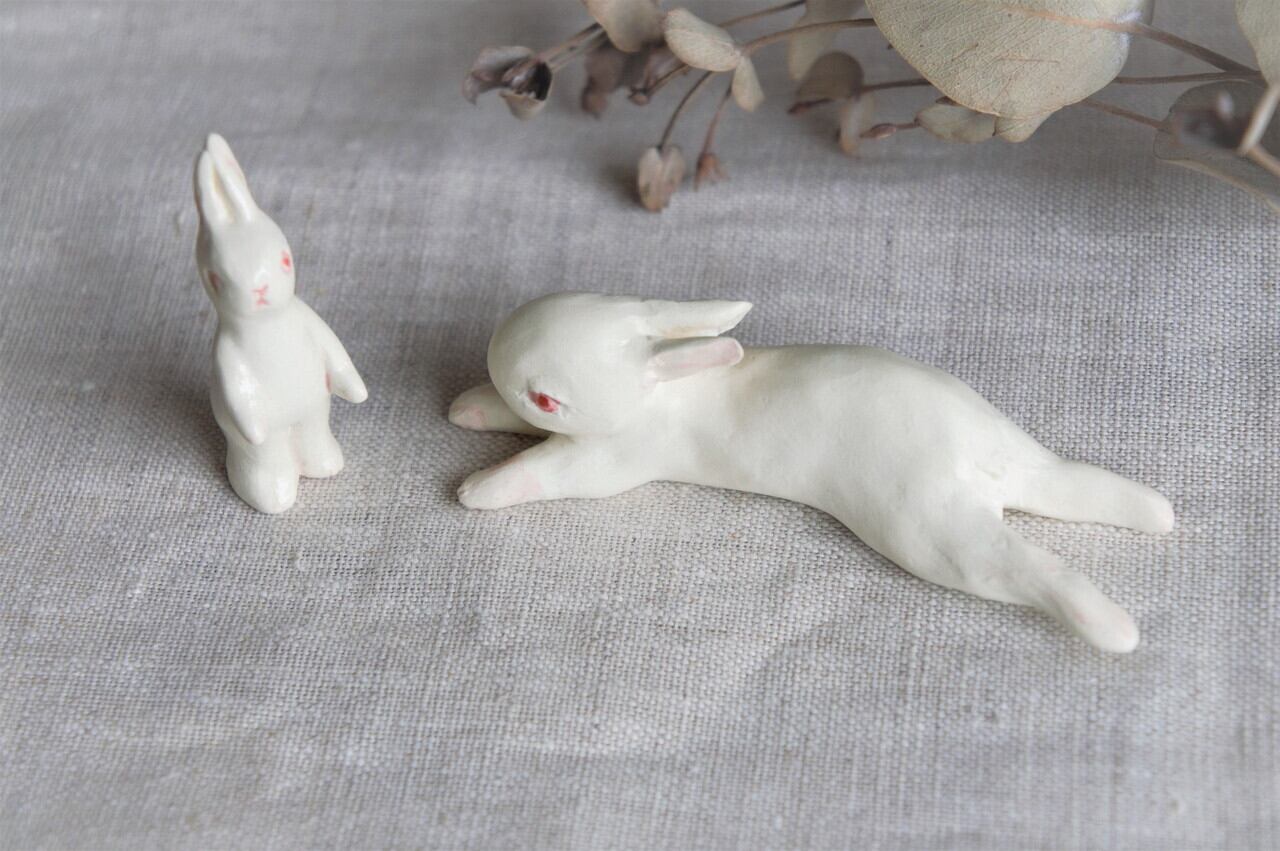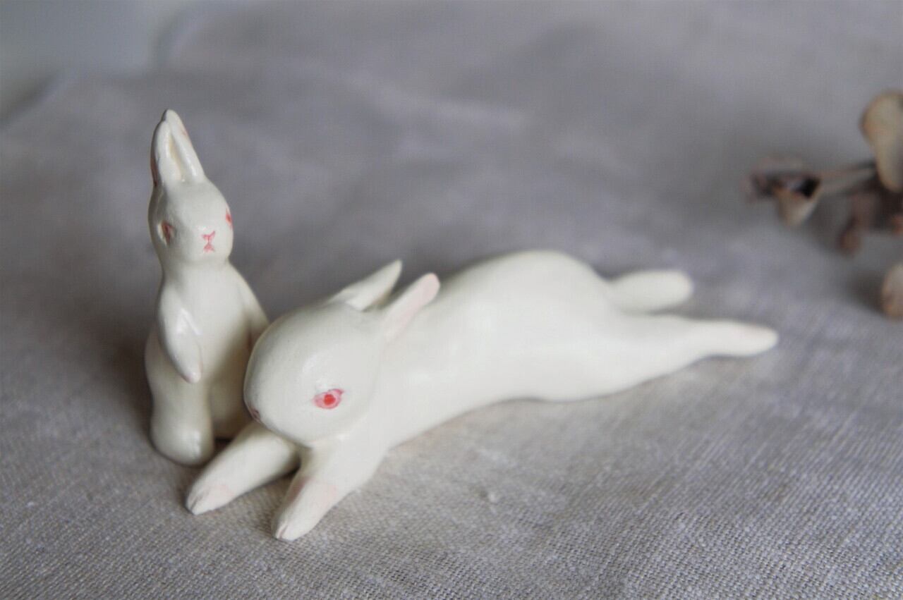 小さい立ちポーズの兎と並んでいる写真もありますが、寝そべっている方のみの価格です。