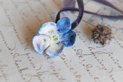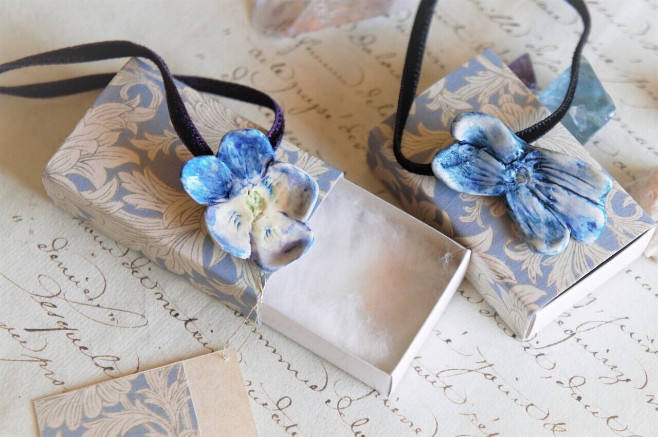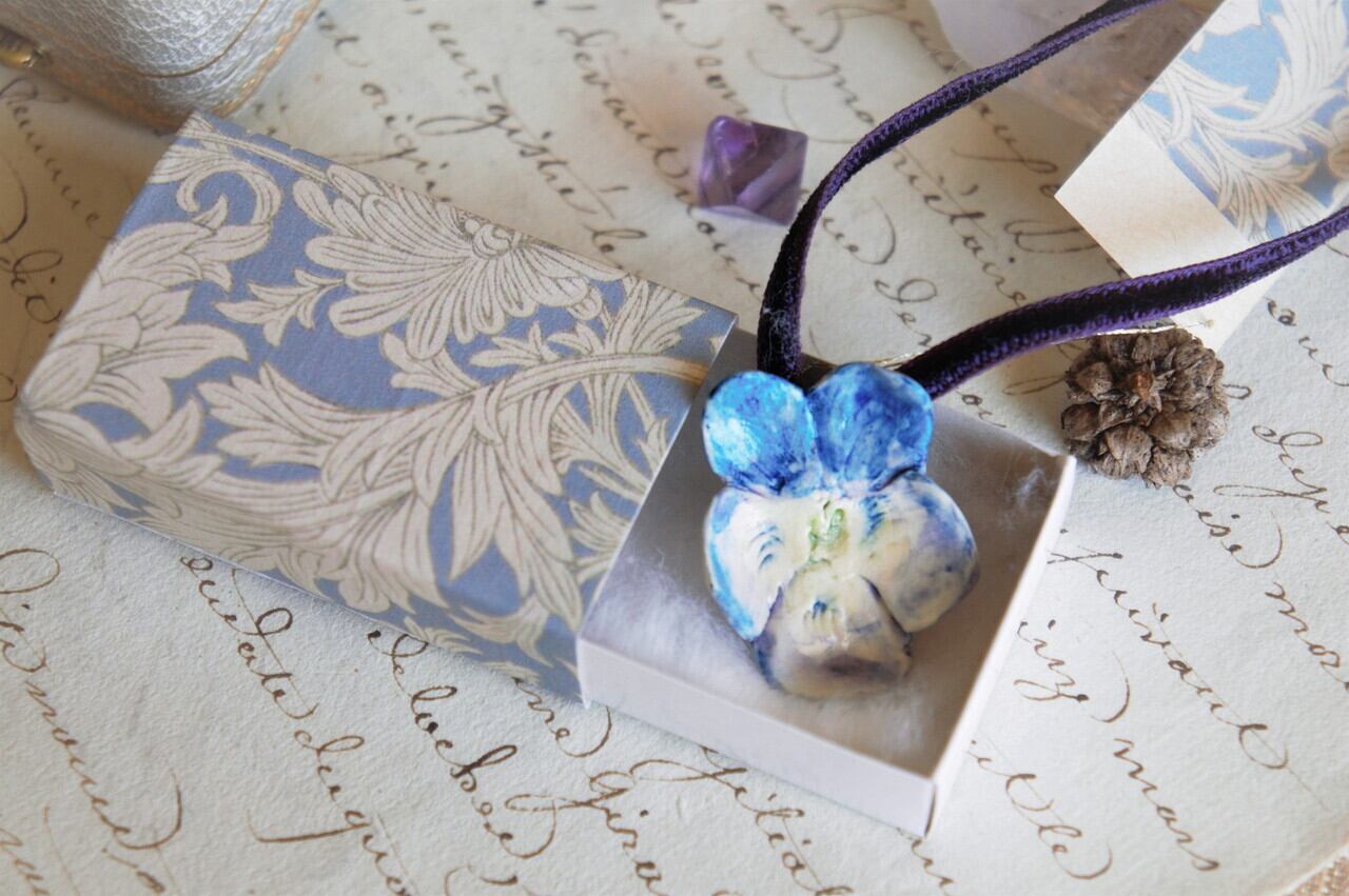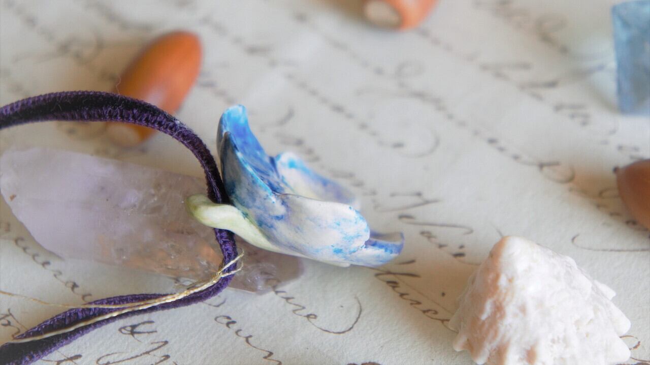 手びねりで制作したちいさなすみれです。裏は茎がわっかになっていて紐を通せます。