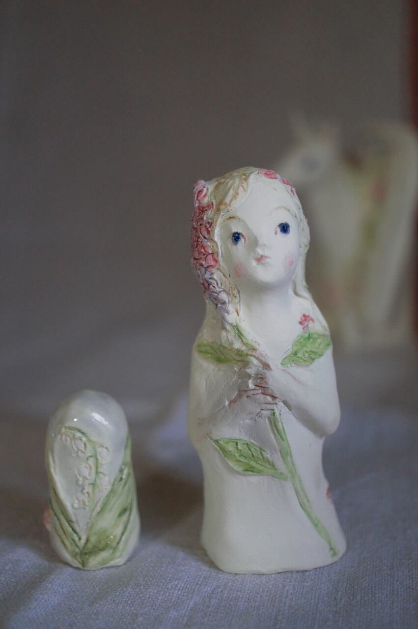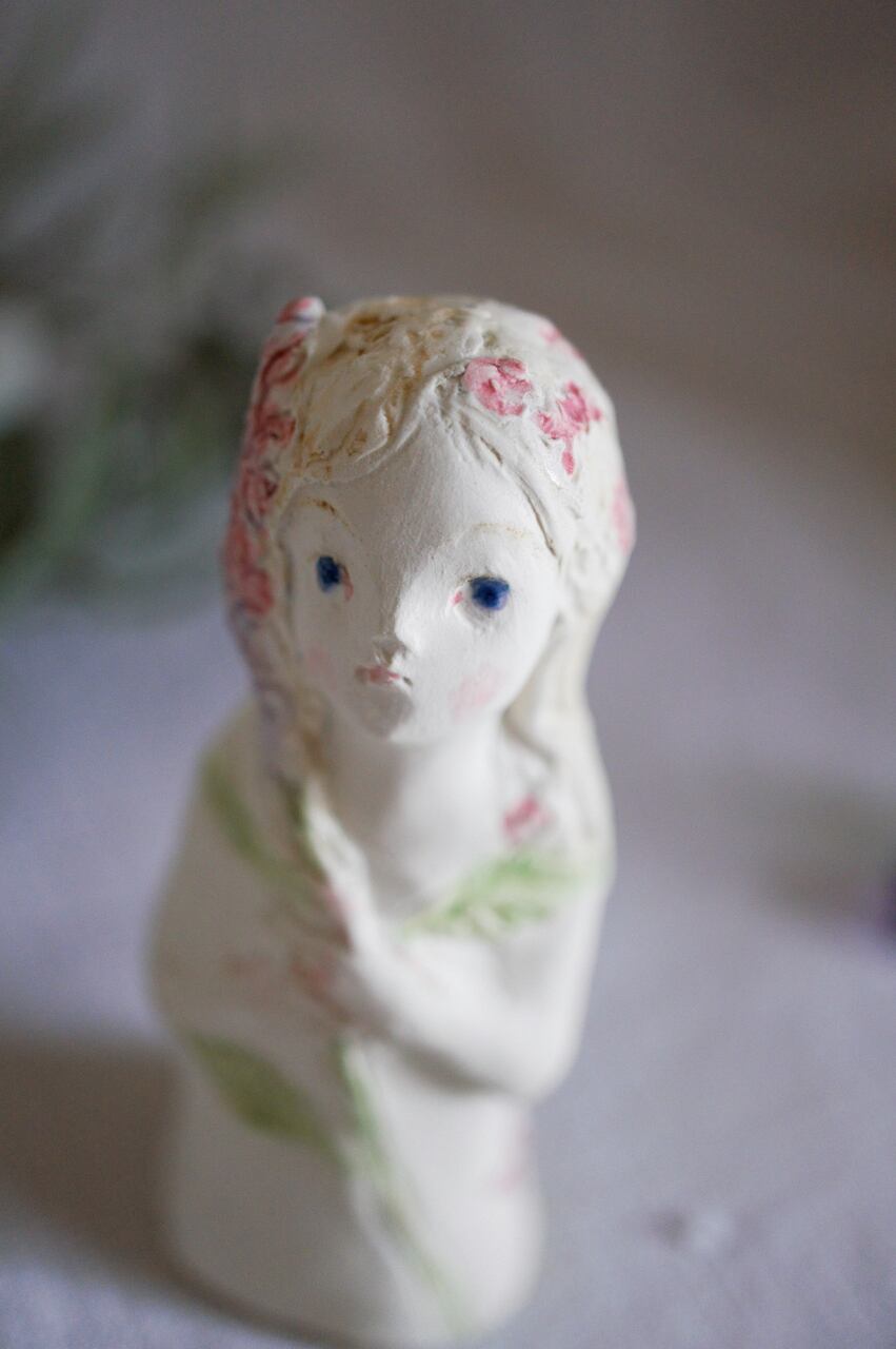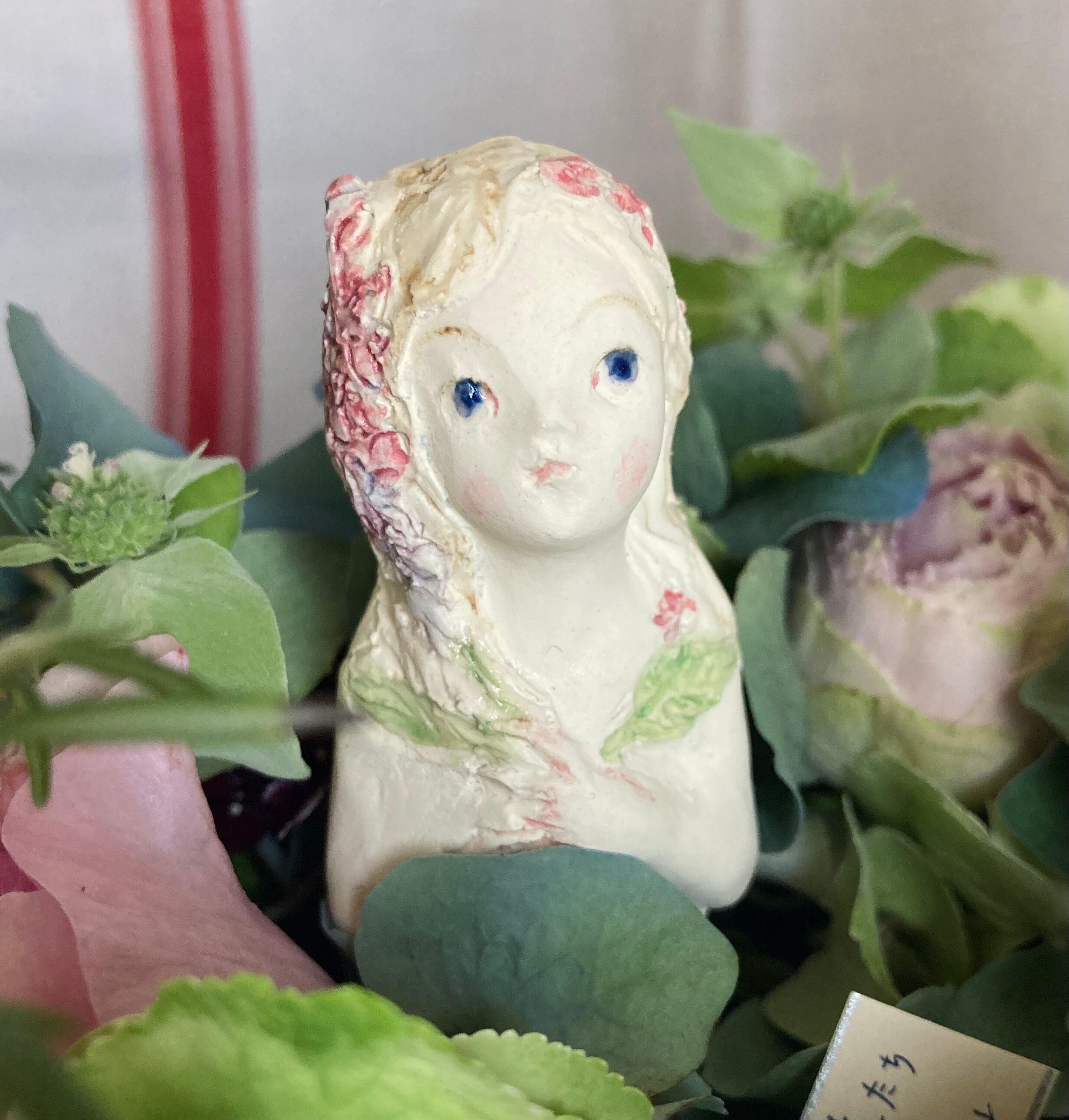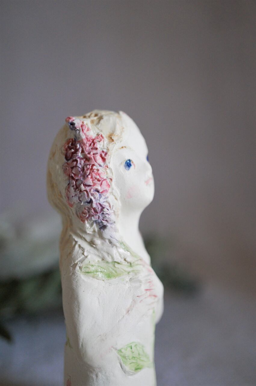 サイズ 約8.5㎝ ライラックのイメージで作った少女 紫がかったブルーの瞳 釉薬がつやつやときらめきます