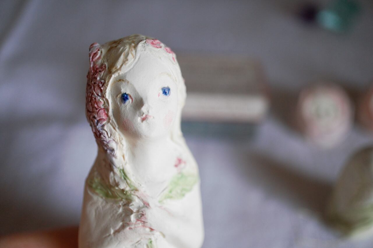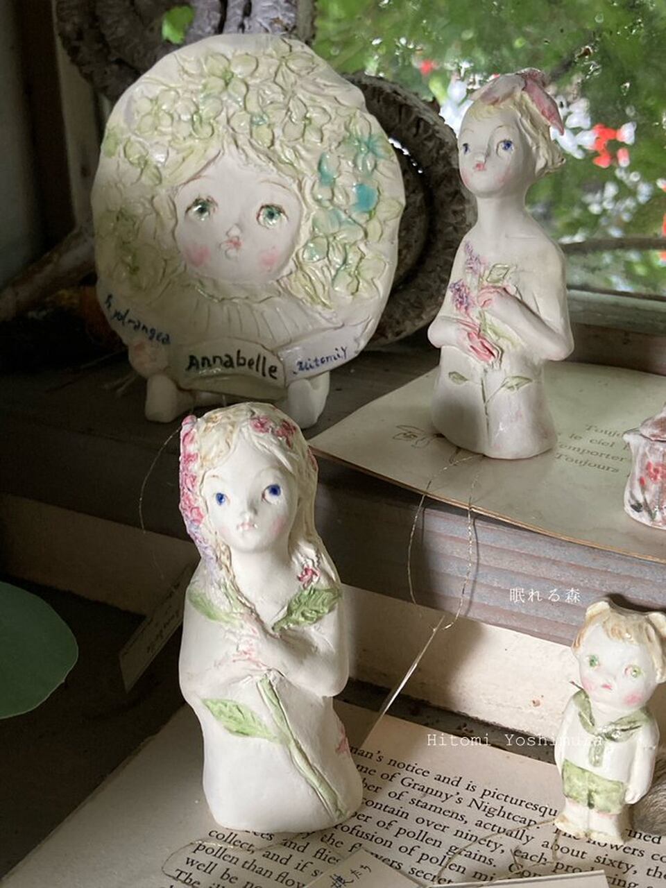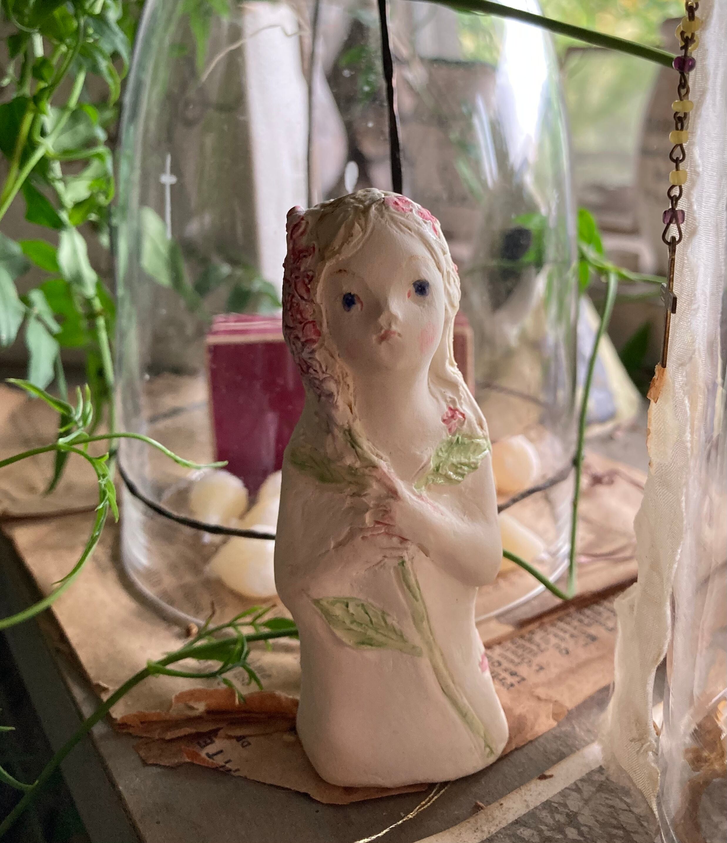 サイズ 約8.5㎝ ライラックのイメージで作った少女 紫がかったブルーの瞳 釉薬がつやつやときらめきます