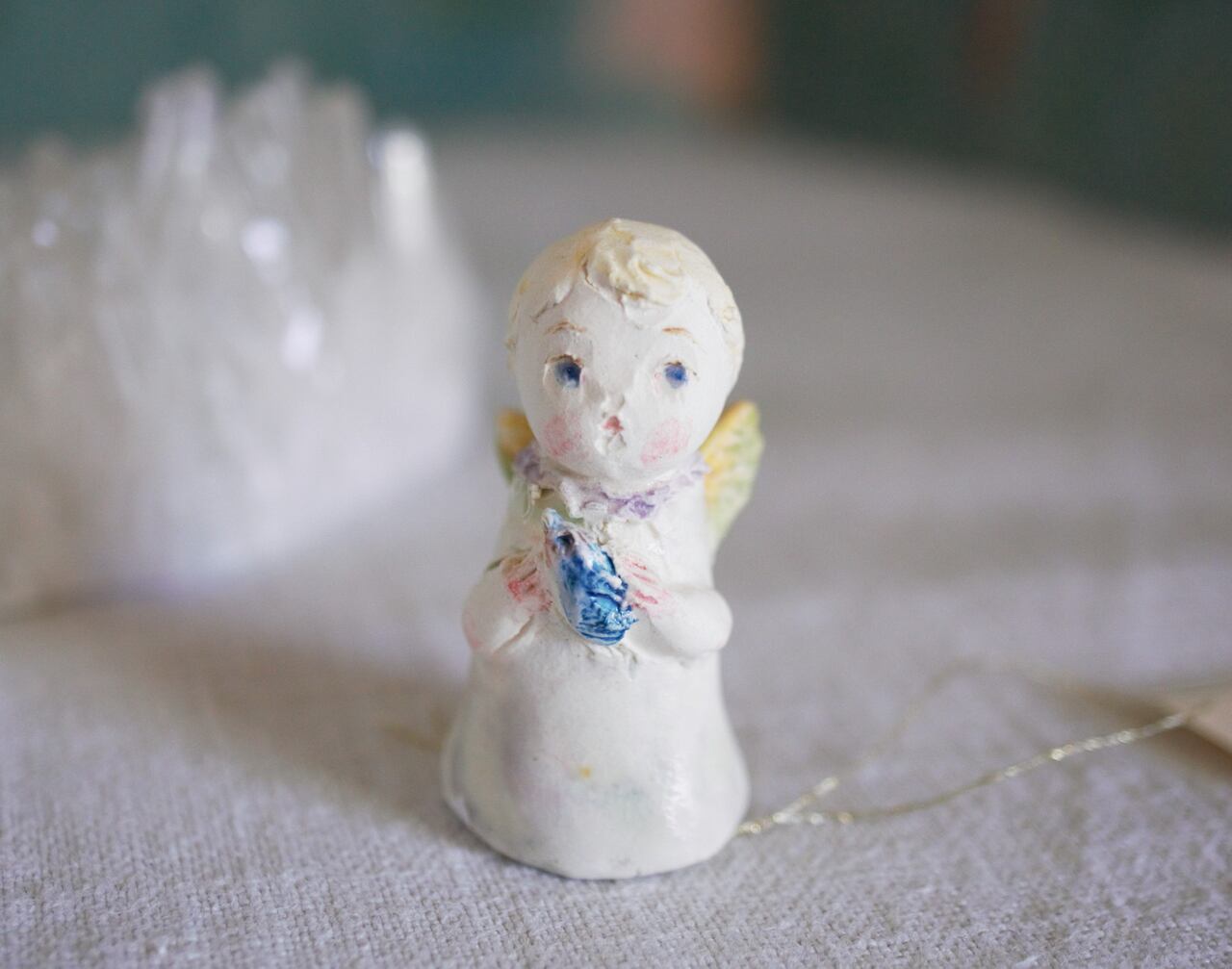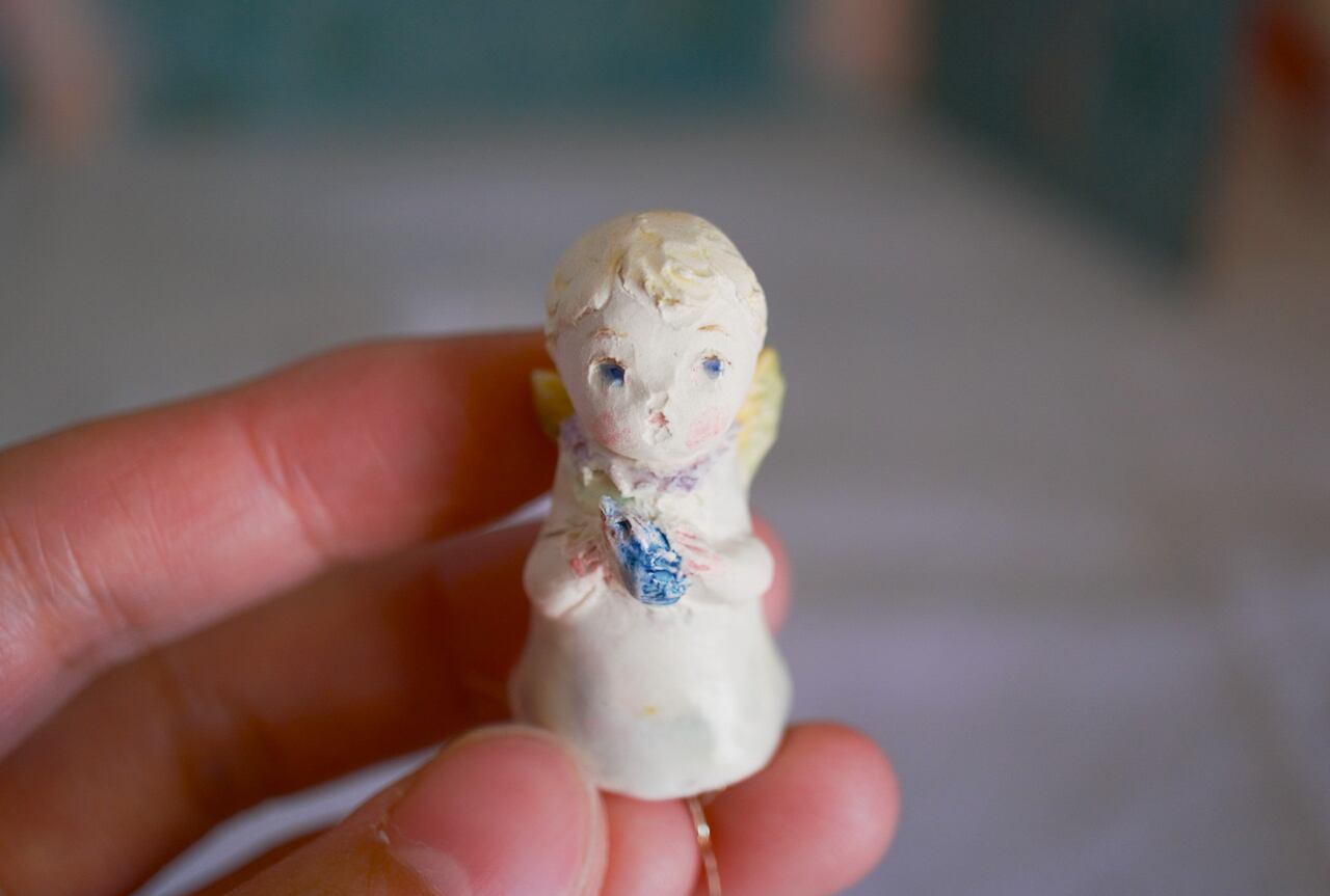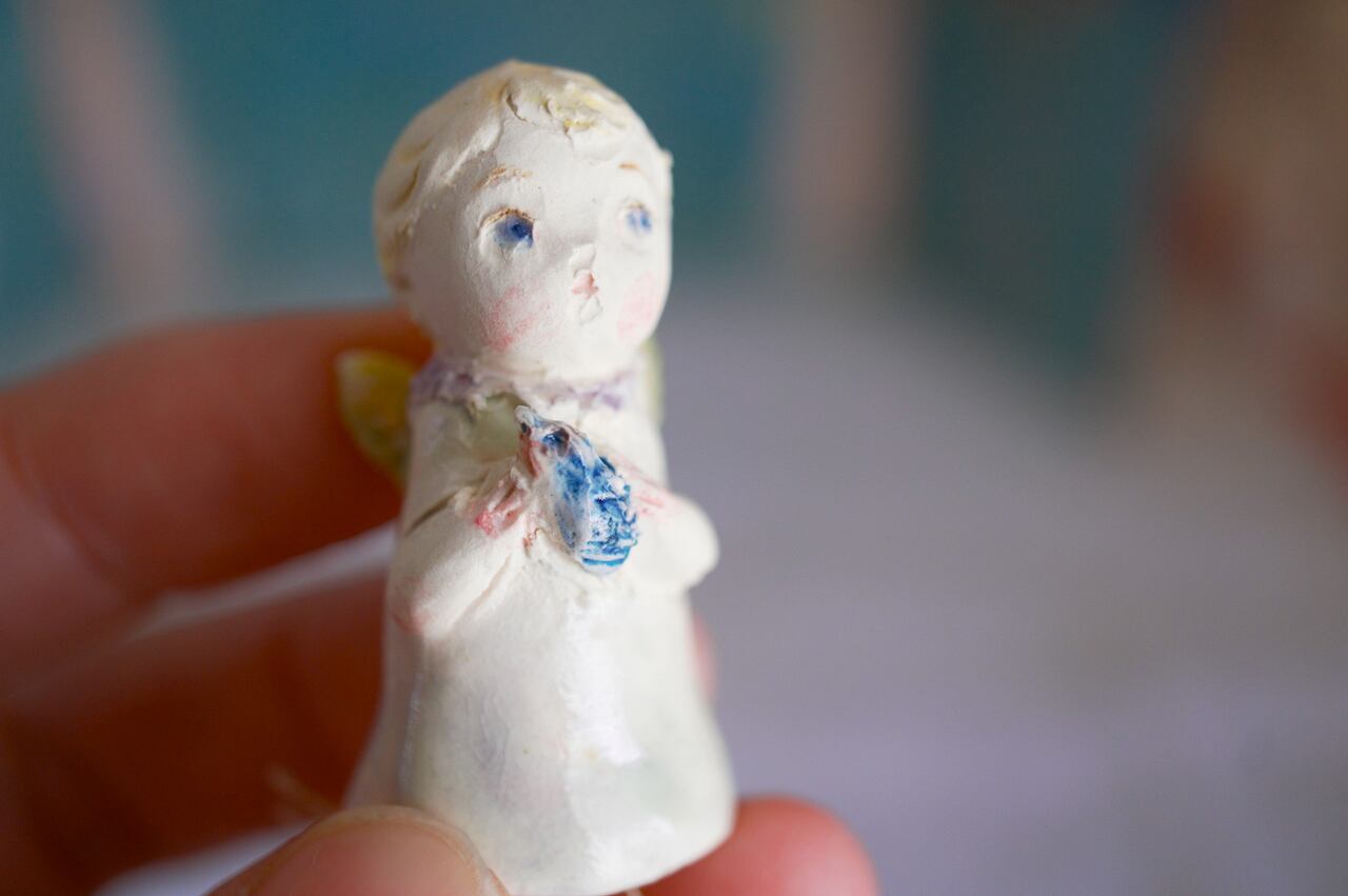 サイズ 高さ約4.3㎝ よく見ると、ちいさな鳥を両手に挟むように抱いています。 小さくてかわいい天使
