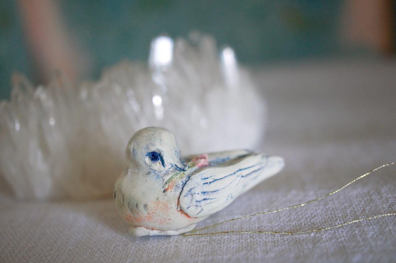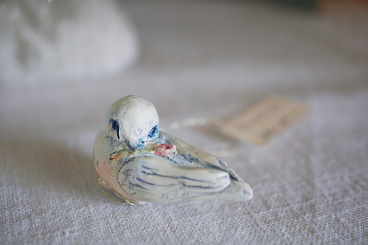 サイズ 4㎝×2.5㎝×2㎝ お花をくわえて、後ろを振り返っている鳥。 まなざしがキリっとしています。