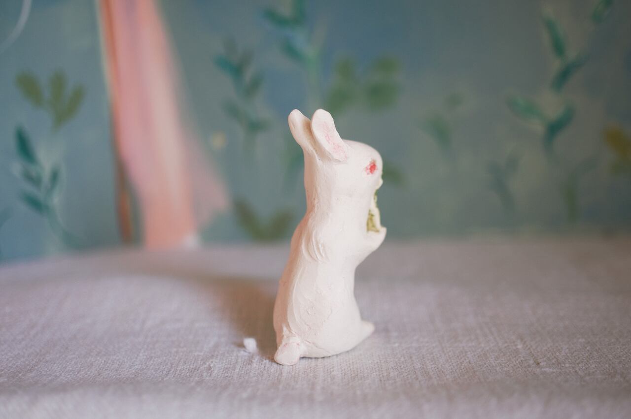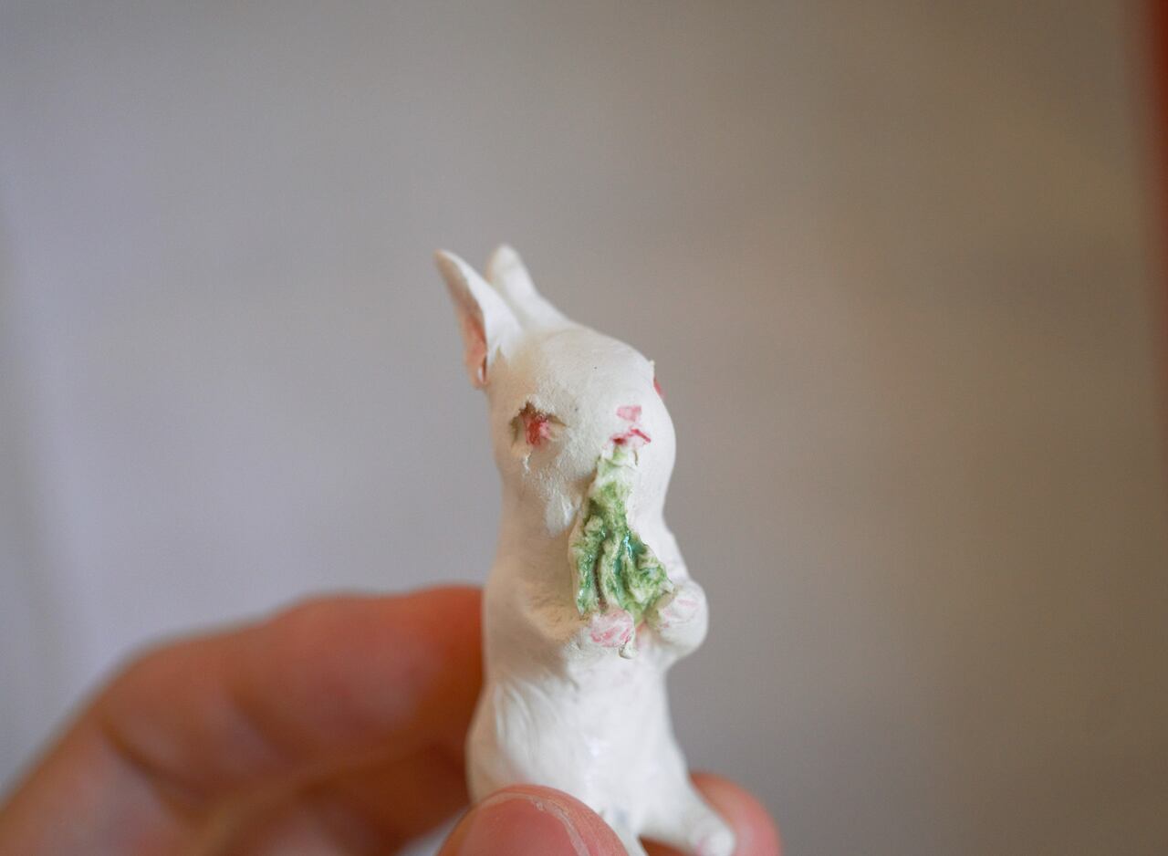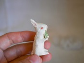 サイズ 高さ約5㎝ 赤い目の白兎。 おいしそうに葉っぱをむしゃむしゃ。