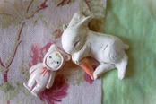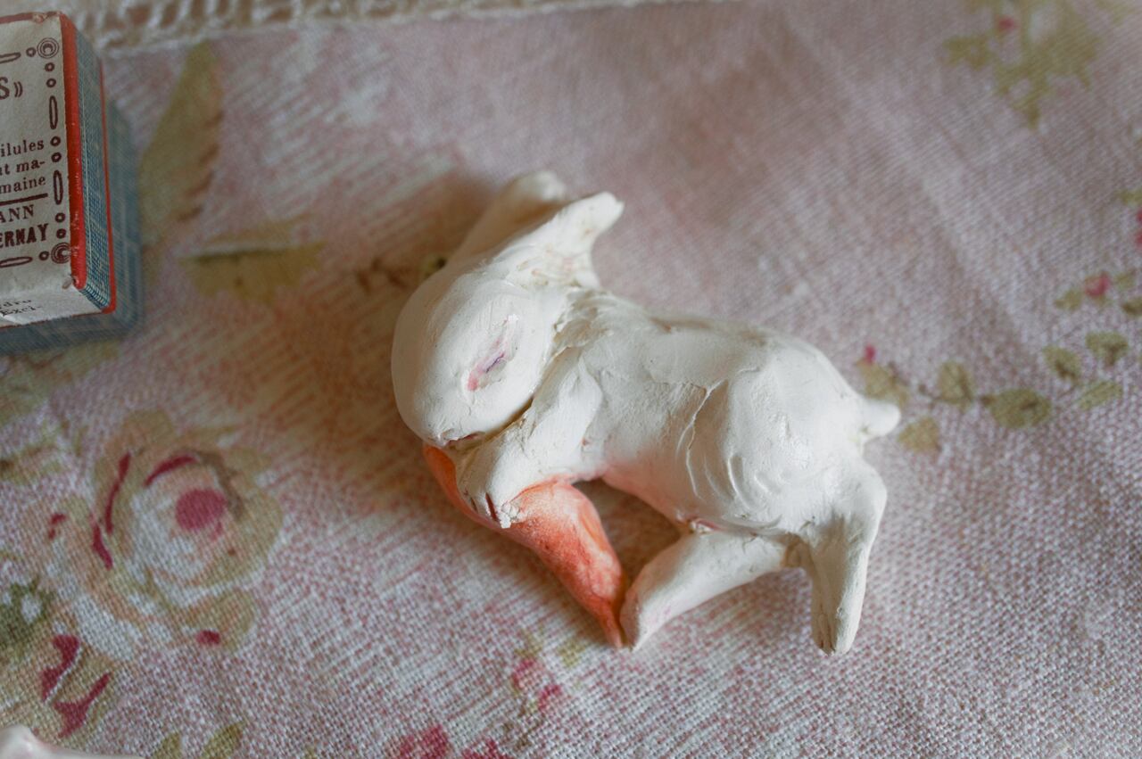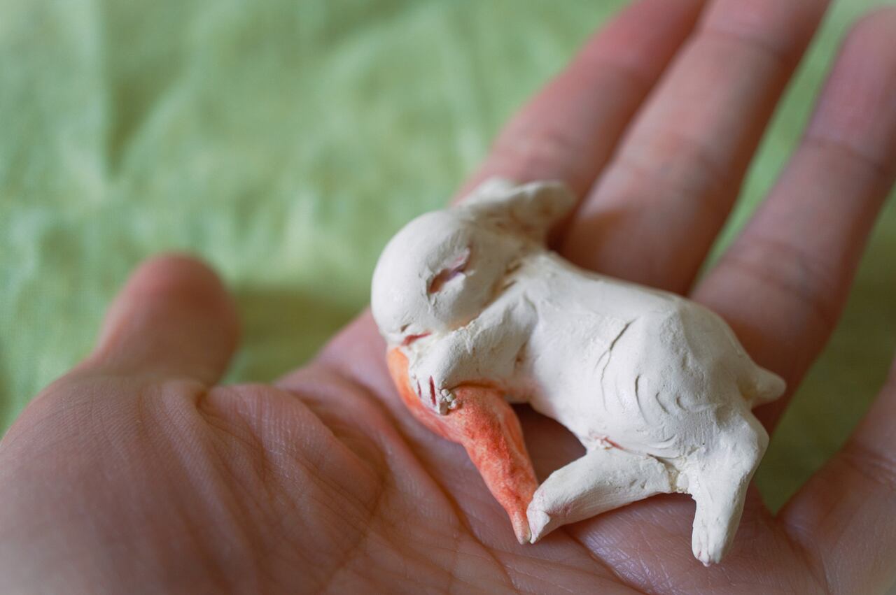 size およそ6×4×2㎝ にんじんをぎゅ、と抱いて眠るうさぎ 良い夢を見ている、穏やかな表情です。