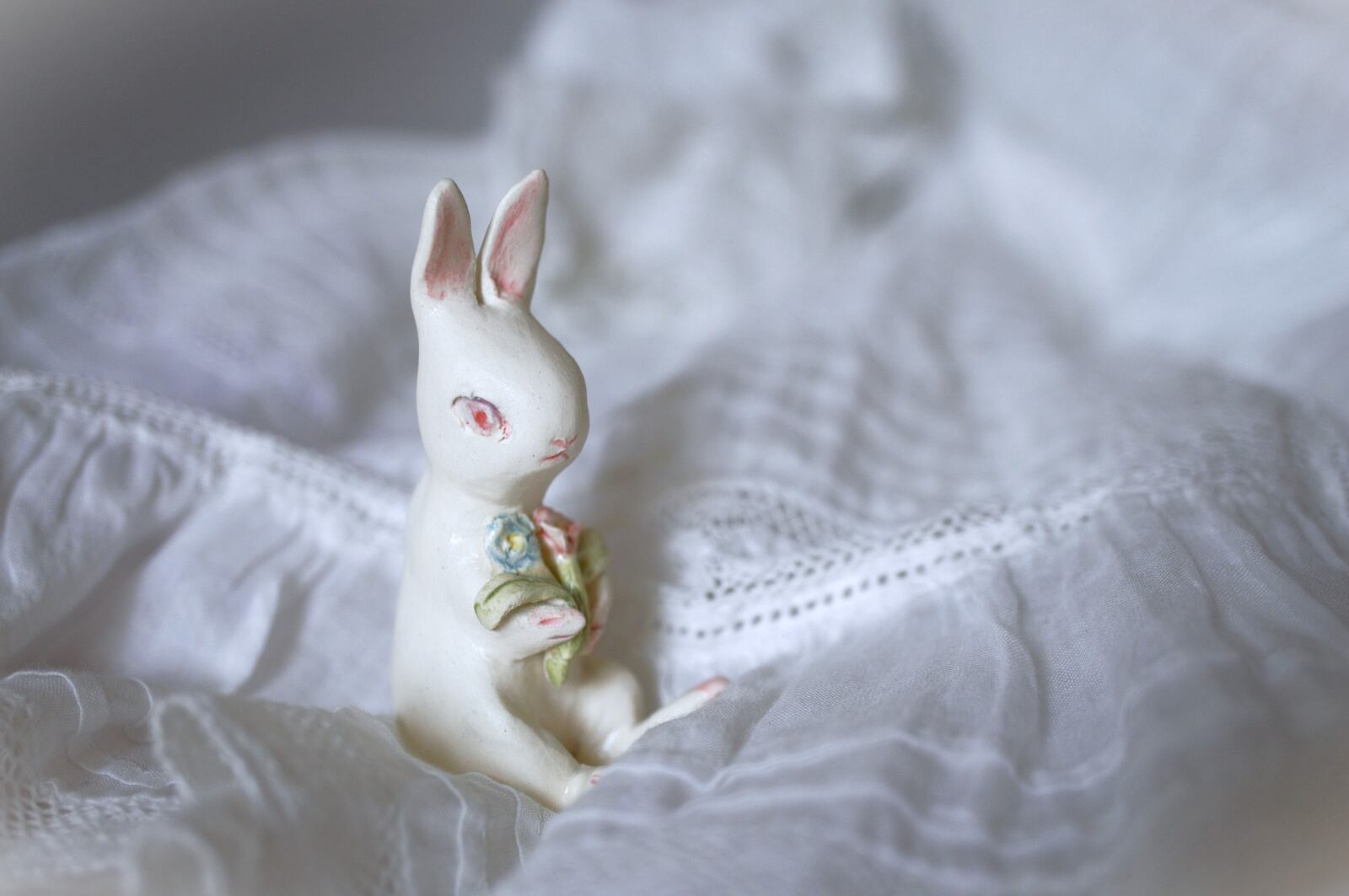 size 高さ6.5㎝ ピンク色と水色のお花のブーケを抱えた白兎 小さめなサイズ感でかわいらしいです。