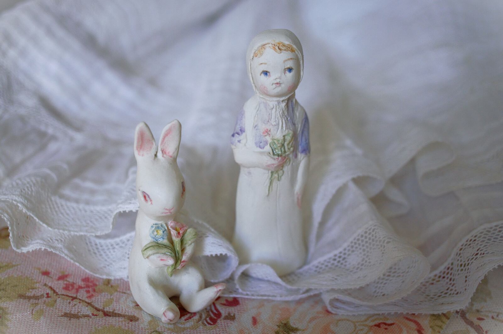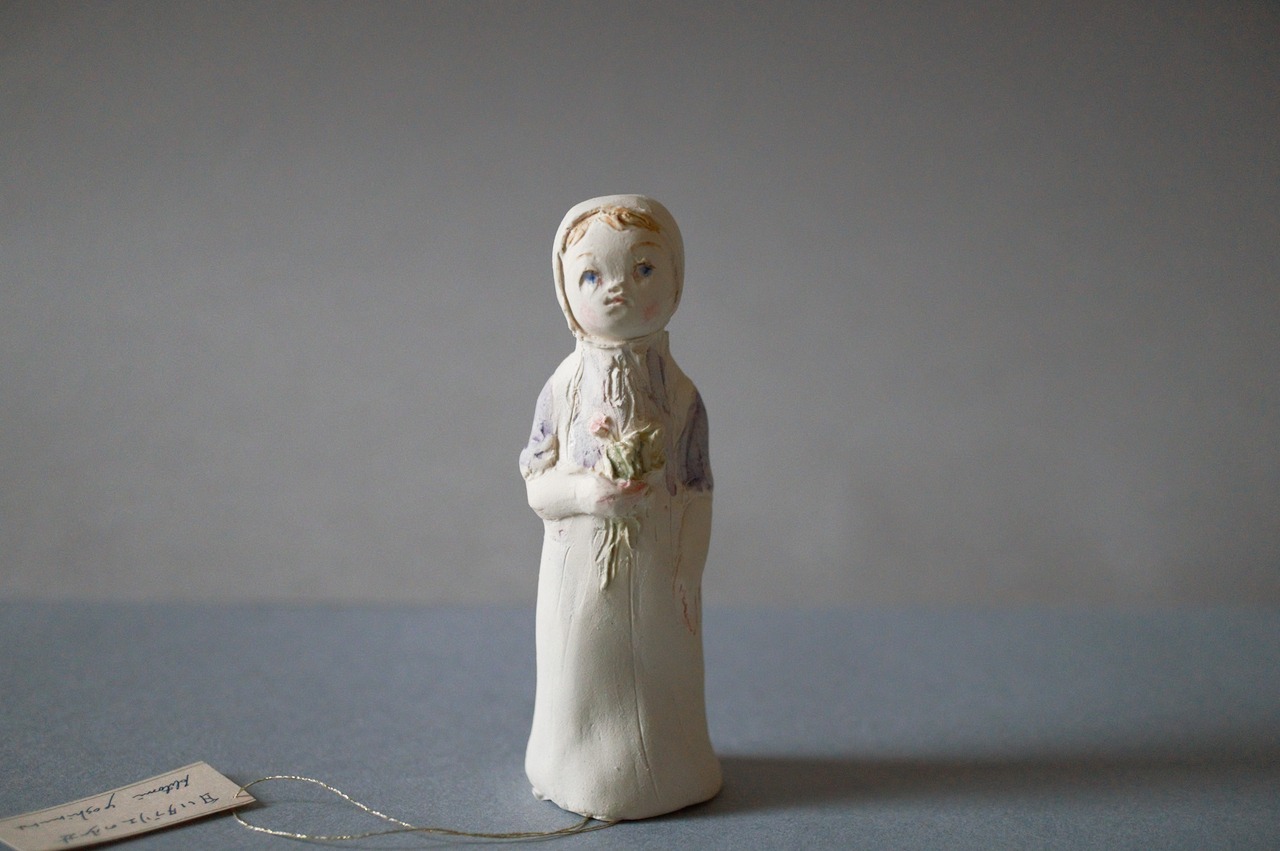 菫色のワンピースに白いタブリエ(エプロン)を重ねています。