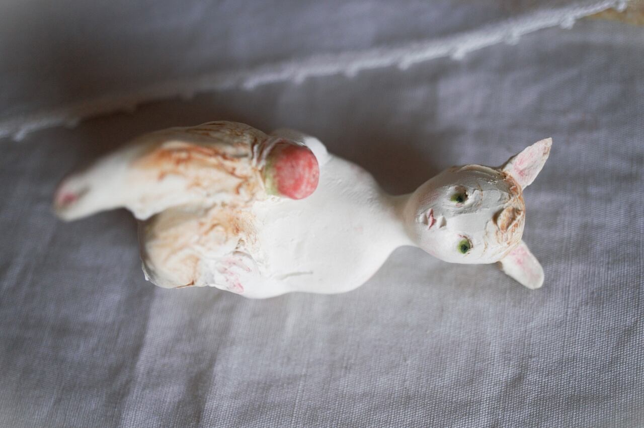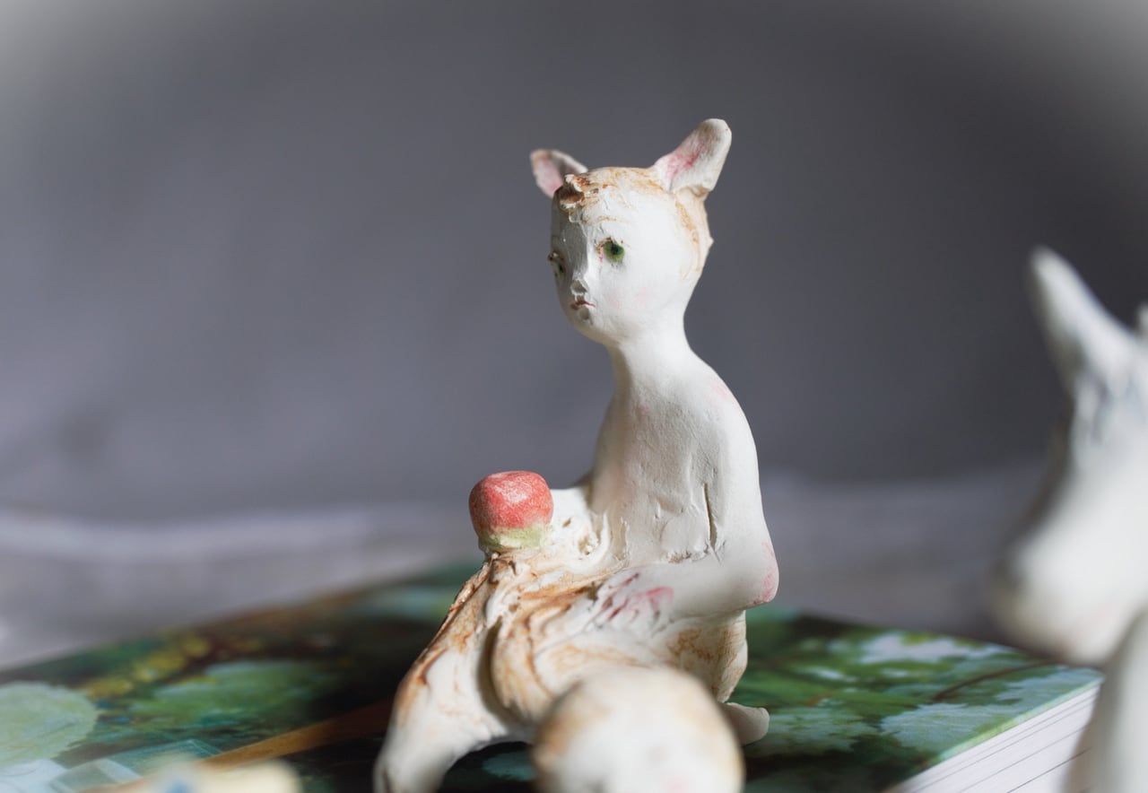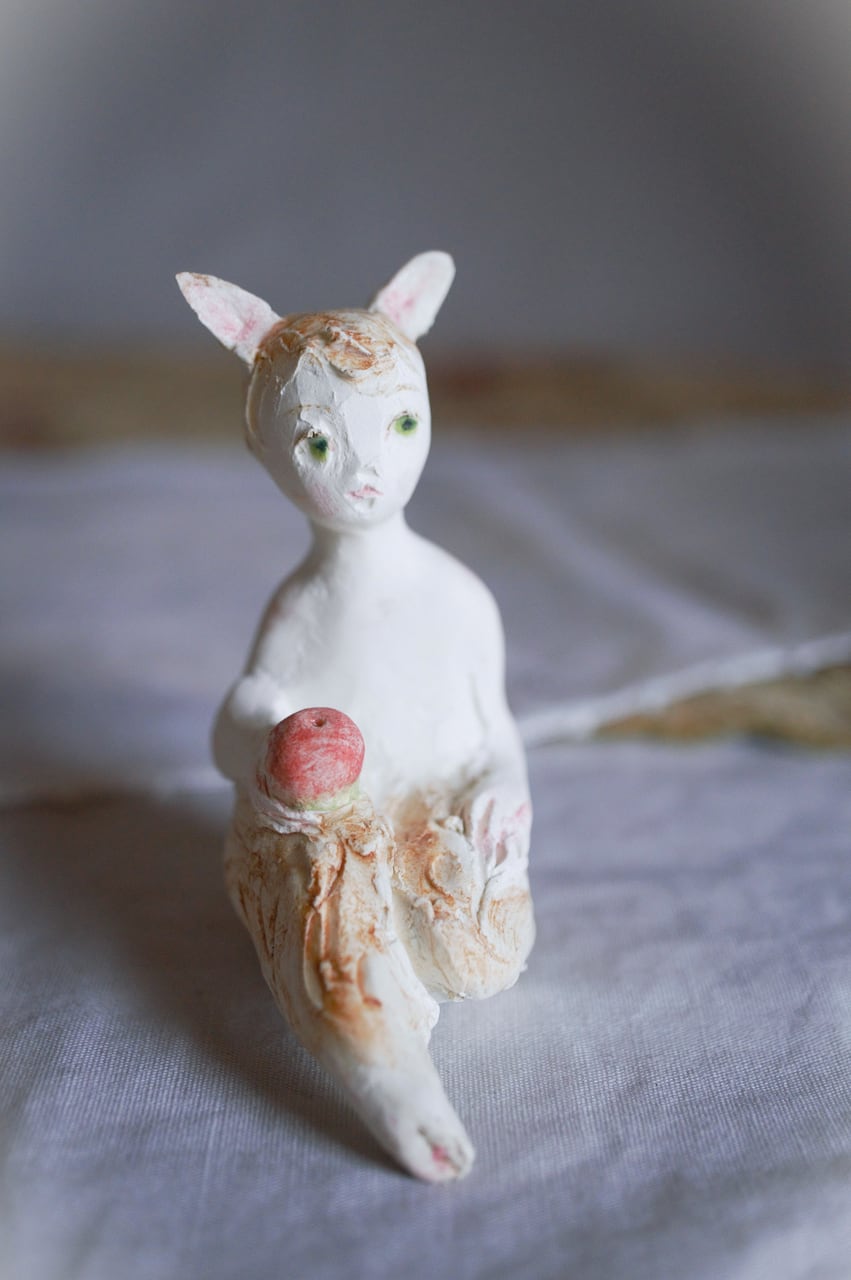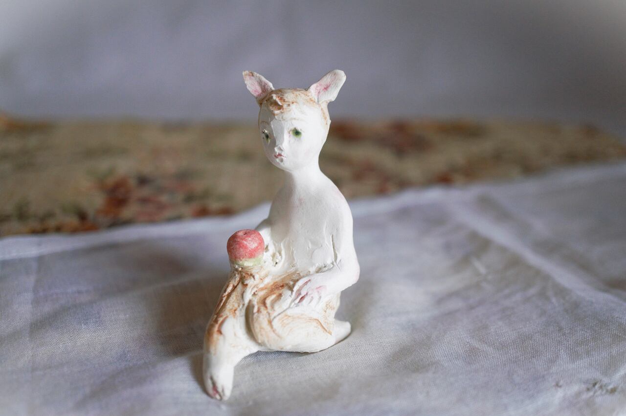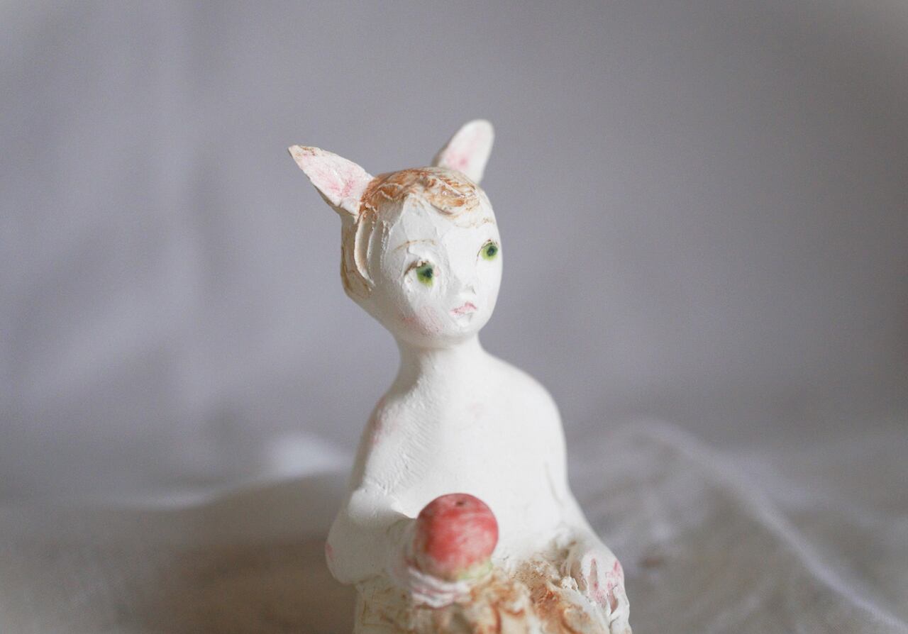 size 高さ約7㎝ 小さな、半獣の子 林檎を持って座っています。